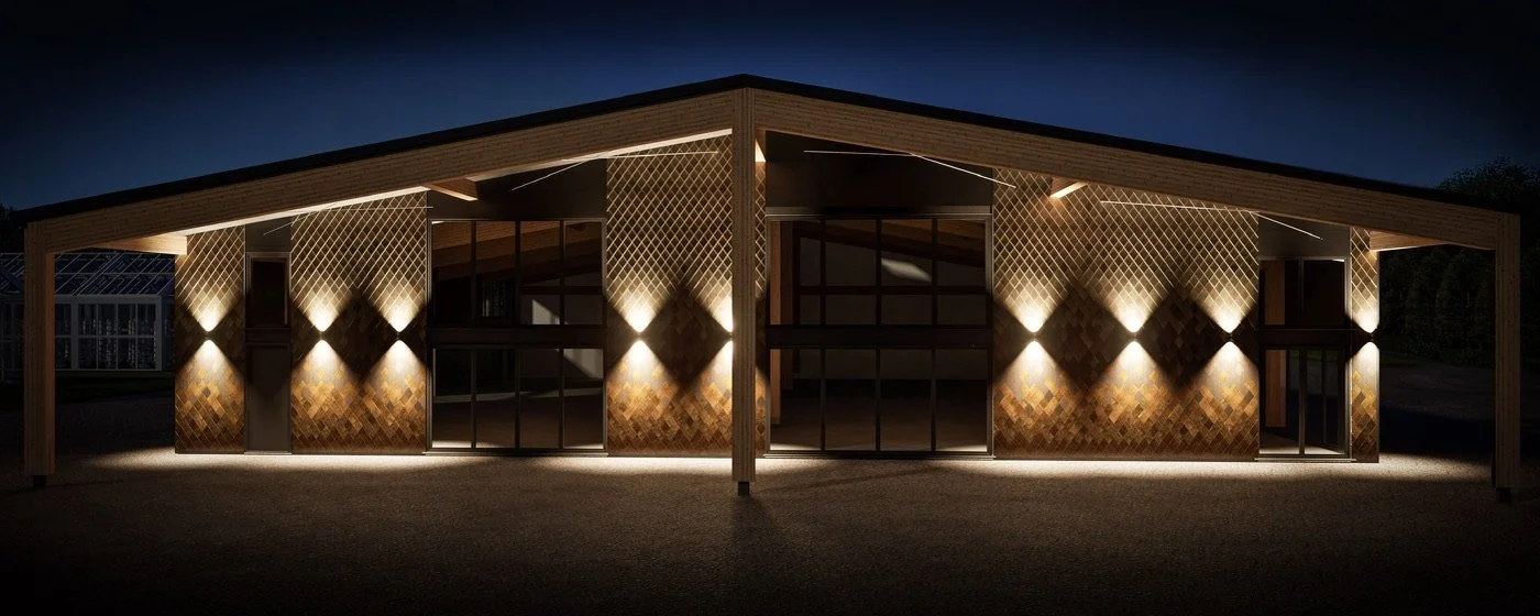 The building is specified with a large glulam frame, manufactured with South West larch - it is clad with four different timber species to illustrate the abundance of viable construction timber in Cornwall, and ceramic tiles made with earth excavated during groundworks for the building.