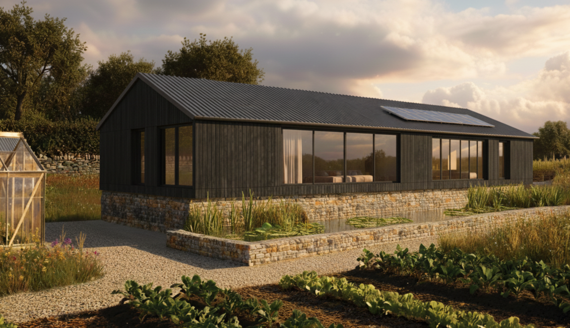 An oak frame home self-built by the family with low-carbon specifications throughout, and fully integrated with off-grid services and energy systems.